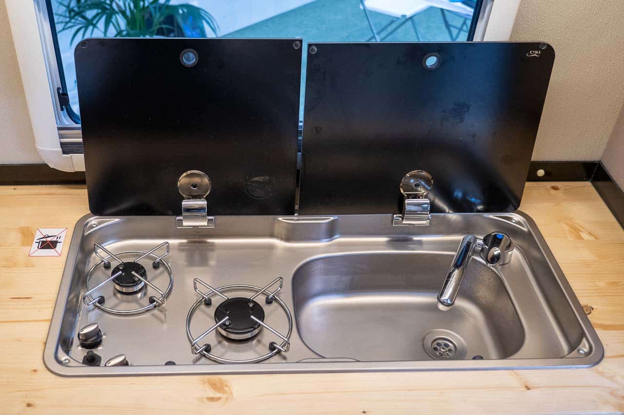 También hay una jabonera en el lavabo. La minicaravana tiene un depósito de agua limpia con una capacidad de 100 litros de agua.