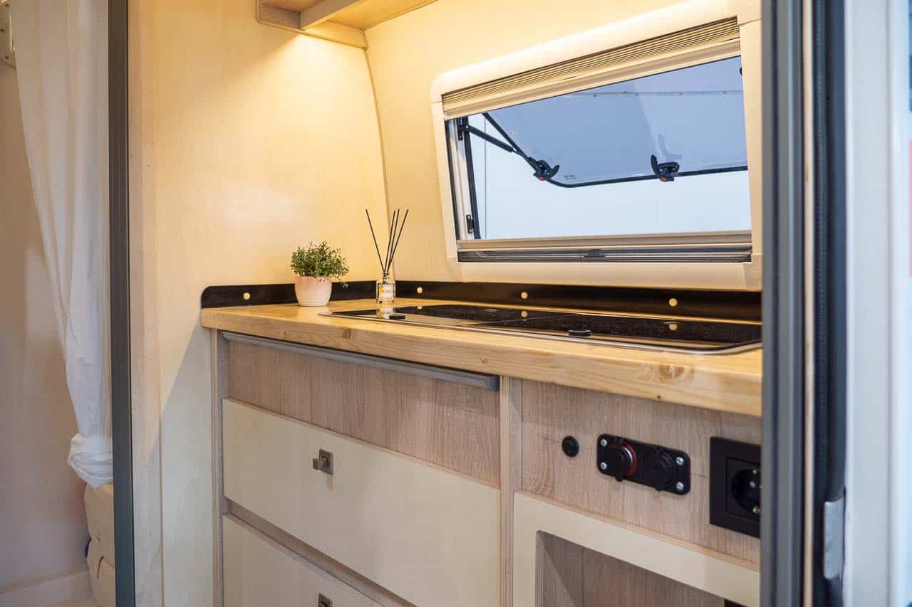 El Pi XL de PinoCaravan es una de esas minicaravanas. La cocina, el cuarto de baño y una zona de estar, que puede convertirse en la cama principal, se acomodan en un espacio mínimo.