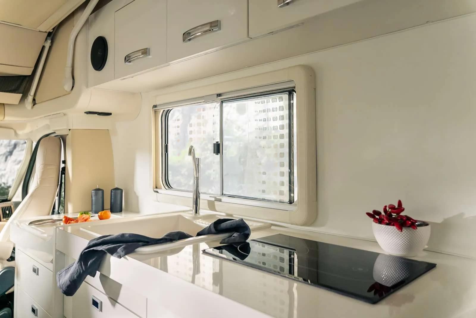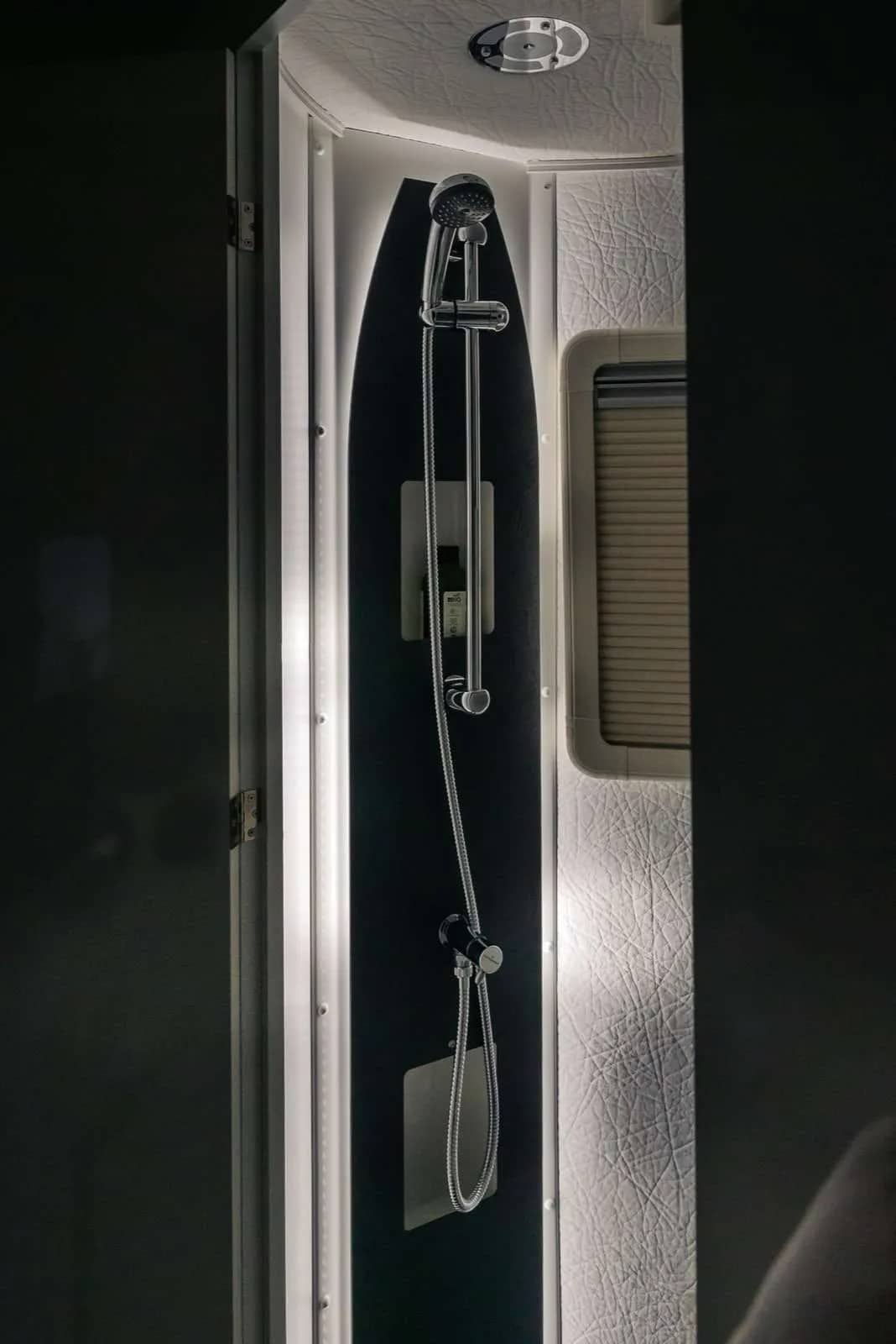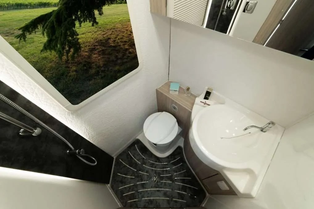 El cuarto húmedo, equipado con inodoro, lavabo y ducha, está situado en la parte trasera del vehículo. El cuarto de baño se puede ventilar fácilmente después de ducharse gracias a la gran ventana. El fregadero esquinero grande es de fibra de vidrio de color marfil. Se utilizó laminado HPL para el compartimento del inodoro.
