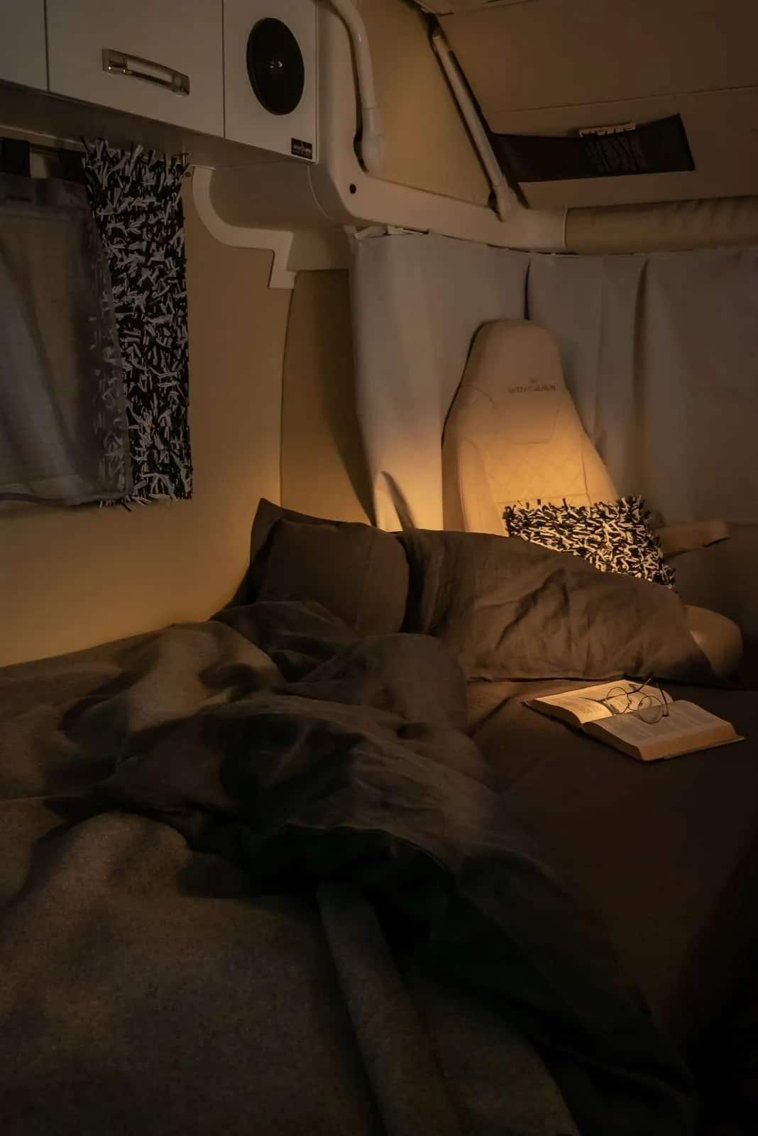 Enfrente está la funcional zona de asientos, que puede utilizarse para comer, trabajar y relajarse. La mesa ovalada también puede ajustarse a la posición deseada. La zona de estar en forma de L puede convertirse en una cama individual si es necesario.