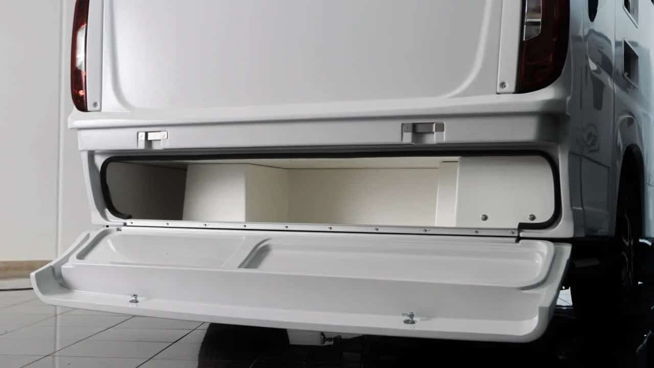 Una puerta ergonómica de fibra de vidrio en la parte trasera promete un mejor aprovechamiento del espacio. Está equipado con escalones para un acceso fácil y seguro. En la puerta hay una cesta de almacenamiento y una cortina de oscurecimiento.