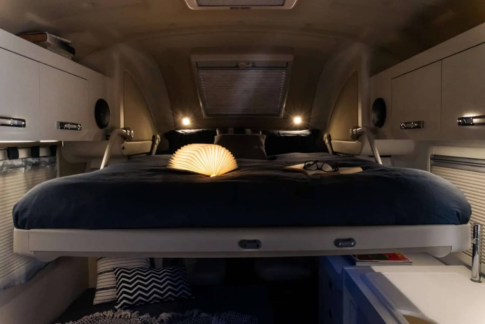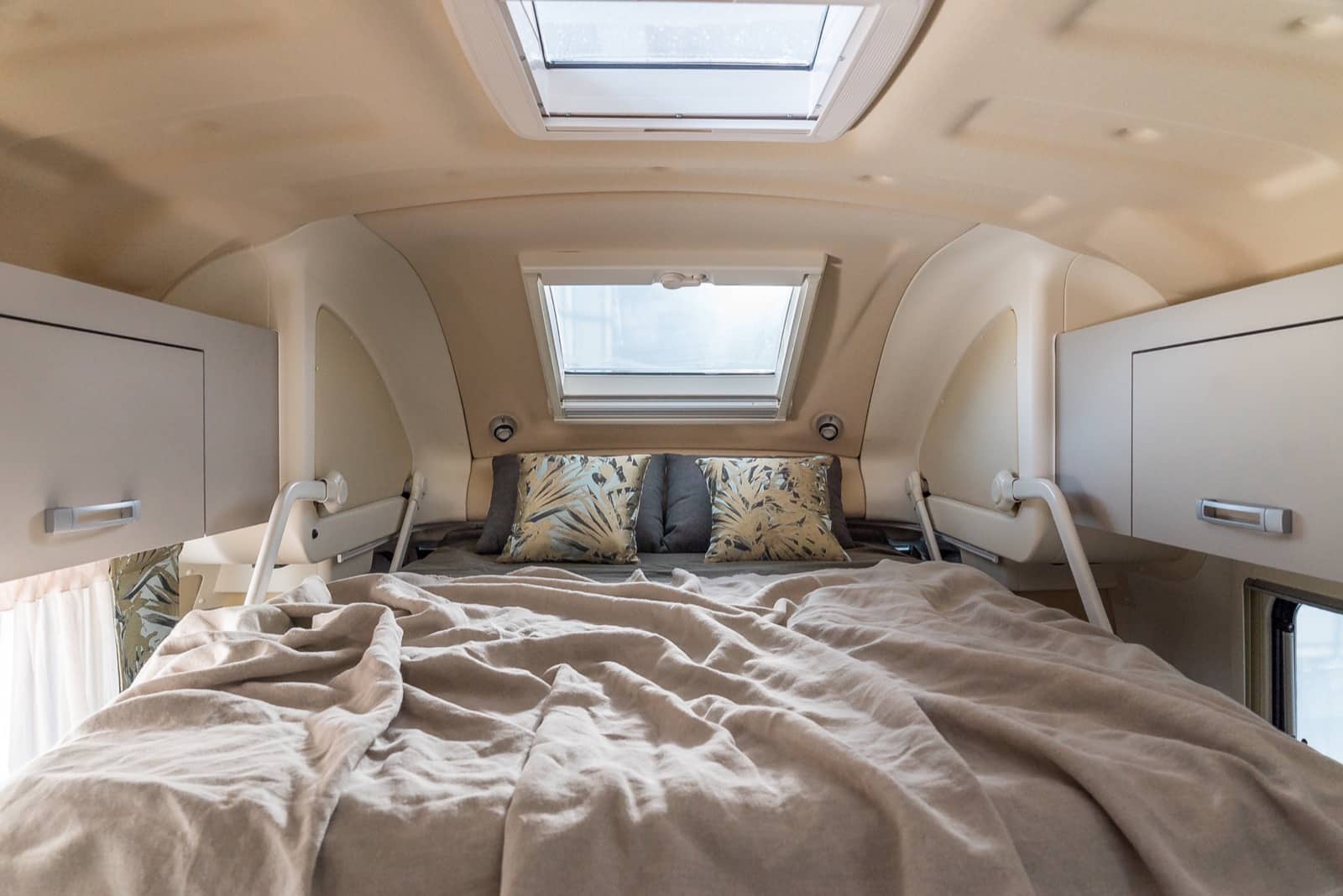 Para dormir hay instalada una cama abatible de 1,35 m x 2 m, que se baja por encima de la zona de asientos. Dos personas pueden dormir cómodamente en la cama de matrimonio con listones de madera y colchón de espuma viscoelástica. También es posible utilizar los armarios de pared desde la cama abatible.